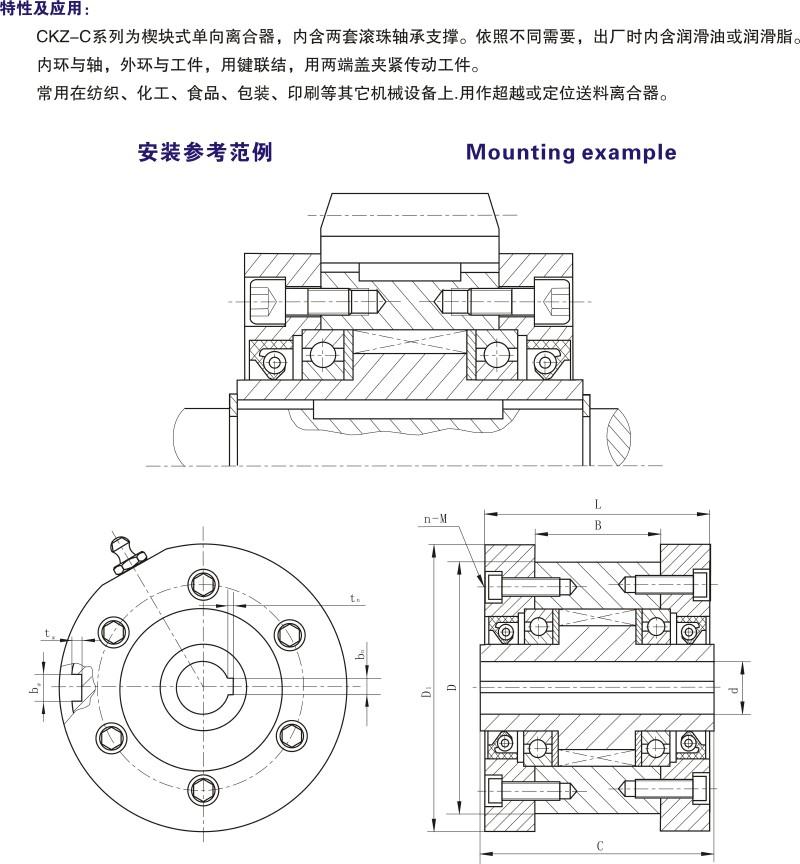 CKZ-C系列為楔塊式單向離合器,內含兩套滾珠軸承支撐。